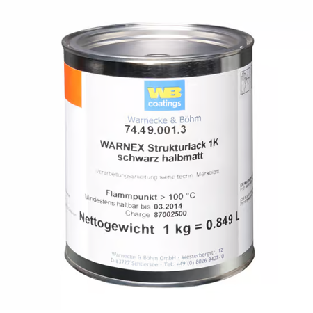 Lakier strukturalny Warnex to atrakcyjna alternatywa dla tradycyjnych powierzchni tekstylnych i z tworzywa sztucznego! Aby uzyskać optymalny efekt, należy stosować pistolet ciśnieniowy. W celu naprawy lub odświeżenia sprzętu lakier można nałożyć również wałeczkiem lub pędzlem. pojemnik 1 kg czarny półmat Proste wykończenie: ekonomiczny – schnie pod wpływem powietrza proekologiczny – rozcieńczany wodą łatwy w użyciu lakier jednoskładnikowy